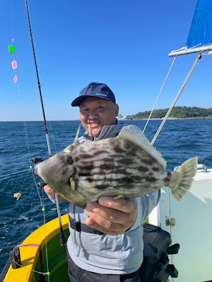 潮が重く?魔法の板が思い通り動かず、自作の魔法の中オモリで潮の抵抗の無くして釣るとあら不思議!?上空の雲が虹色の見た事ない色になり、そこから僕のハリにカワハギが上げると付いていて最終的に7枚で両隣の名人に追い付き三人仲良く7枚の竿頭でした。